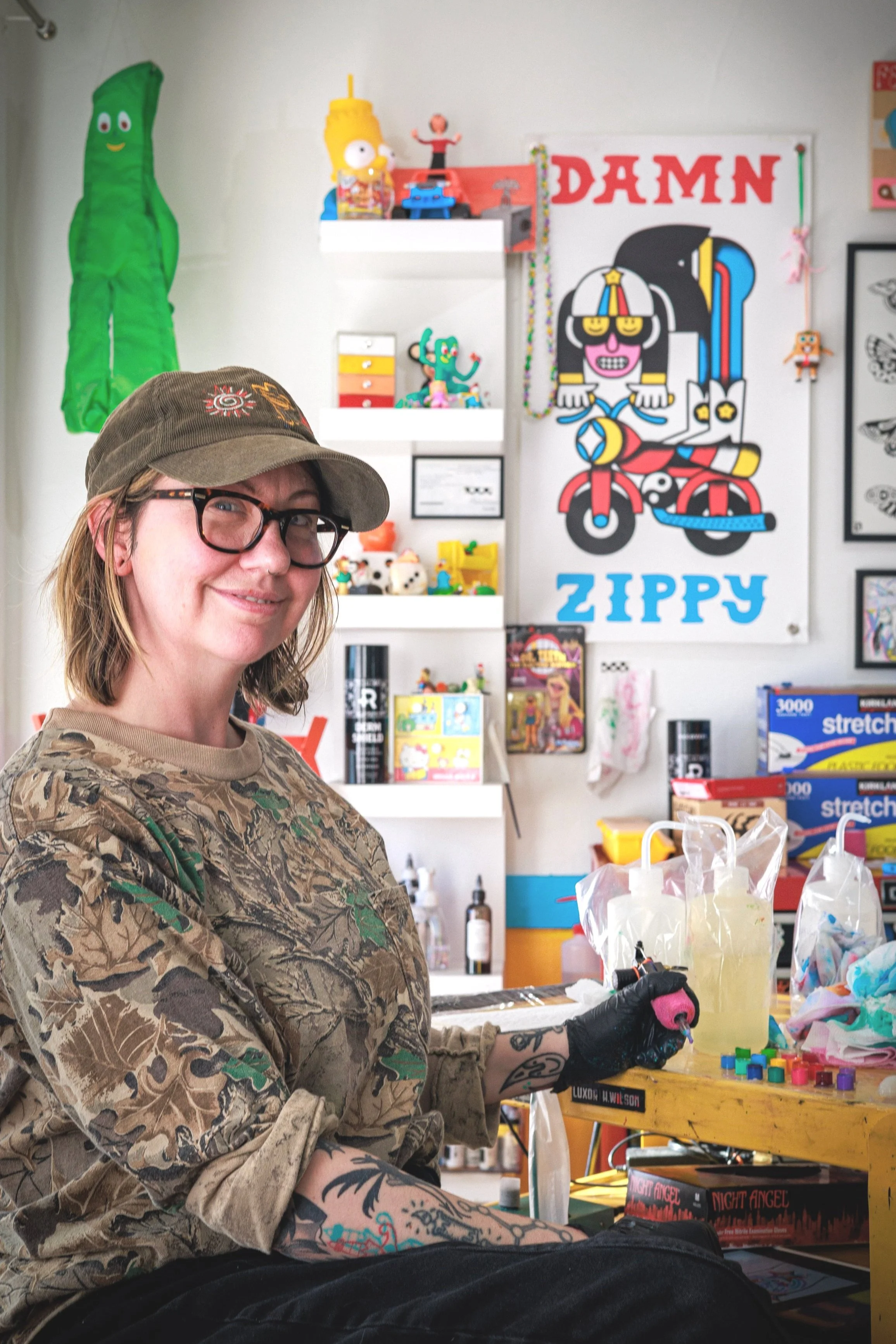 Zippy, also known as Olive, works and lives primarily in Portland Oregon. The main focus of tattooing for her is having FUN - what evokes that for her is cartoons and movies from the 80’s and 90’s, kids’ stuff, bold lines, bright colors, and also looking a little deeper, weirder, and perhaps trippier into the things that bring us joy and comfort.